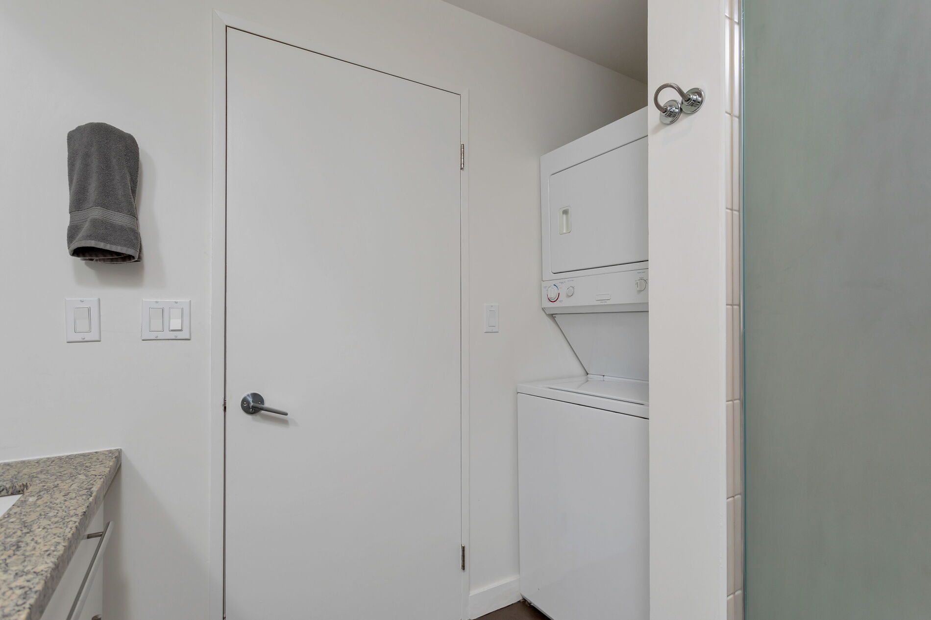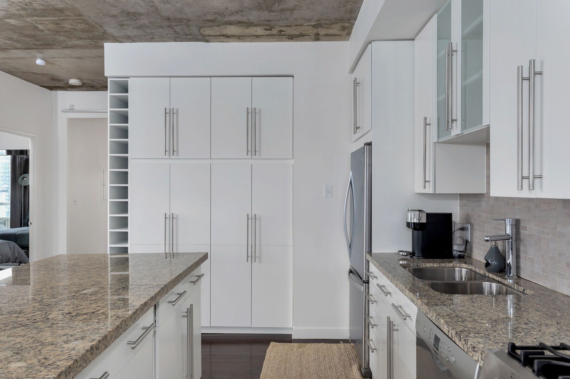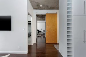 Imagine starting your morning with sunlight pouring through floor-to-ceiling windows, the city stretching out before you and the lake shimmering in the distance. Inside, this refined 2-bedroom, 2-bath lower penthouse offers 1,245 sq. ft. of thoughtfully designed living space, where hardwood floors, 9-foot exposed concrete ceilings, and sleek modern finishes create a calm yet striking urban retreat. A private balcony off the second bedroom adds a quiet escape—perfect for morning coffee or an evening wind-down.